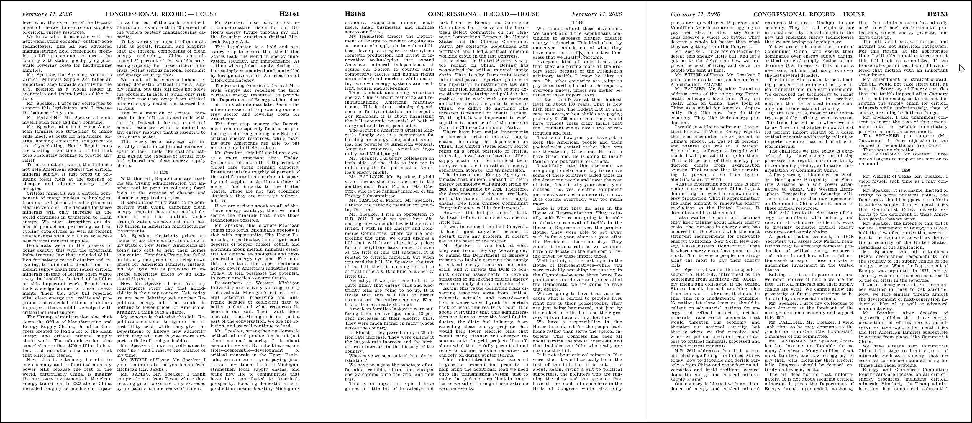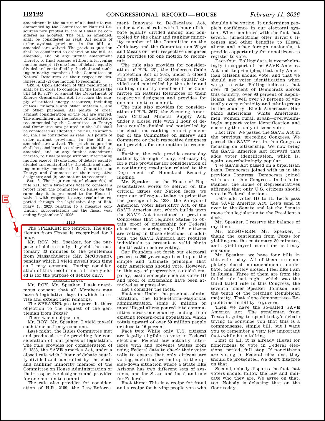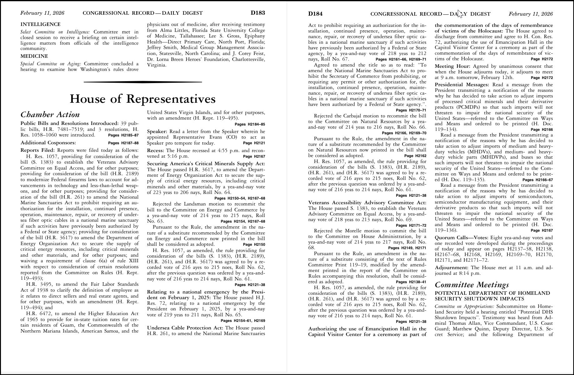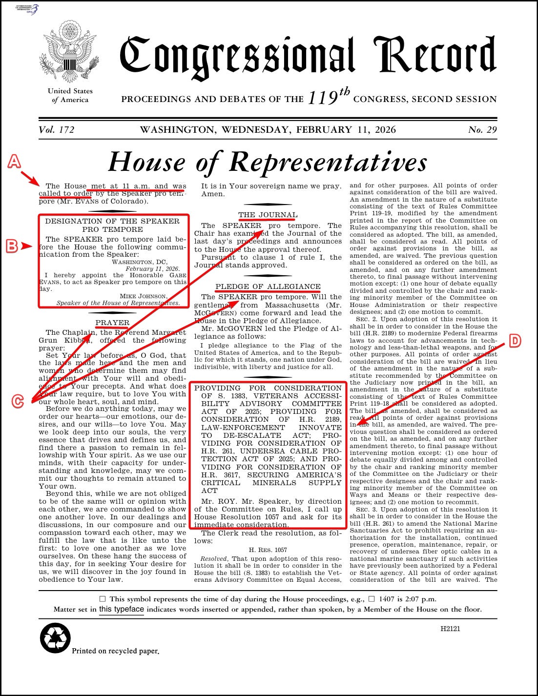 Let’s start. It’s the morning of February 12, 2026.1 You crack open yesterday’s congressional record from Wednesday, February 11th and turn to the proceedings of the House. We can walk through it, letter by letter.