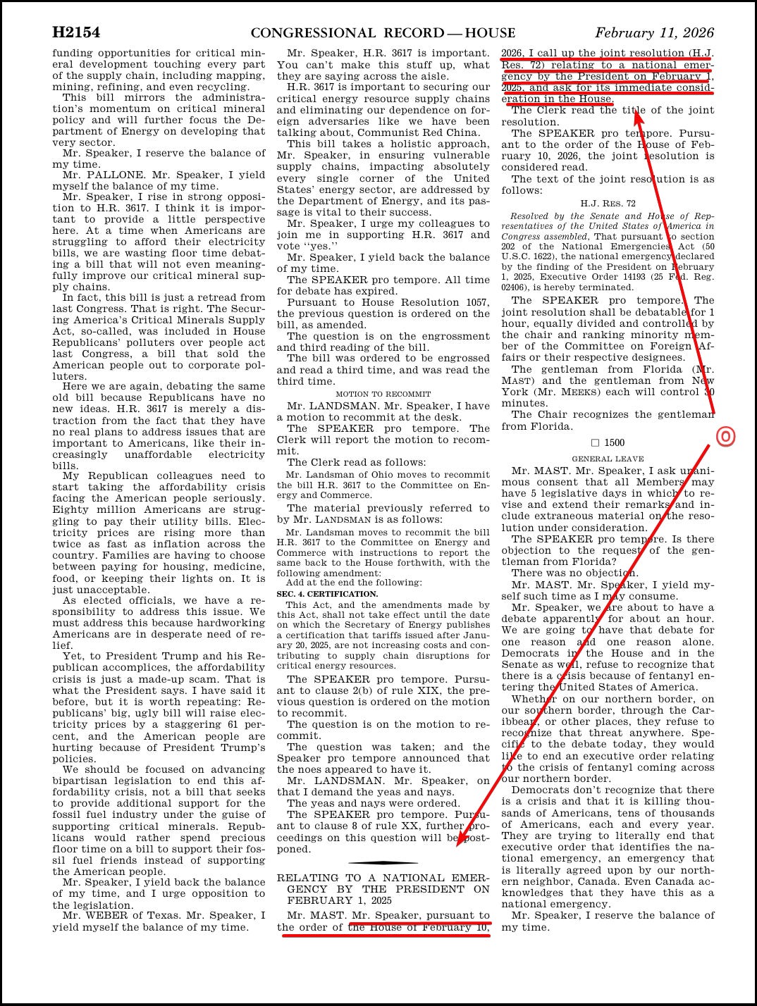 O. Calling up H.J.Res.72, to terminate a national emergency. Rep. Mast is recognized and calls up H.J.Res.72 pursuant to an order of the previous day (February 10). What is going on here?