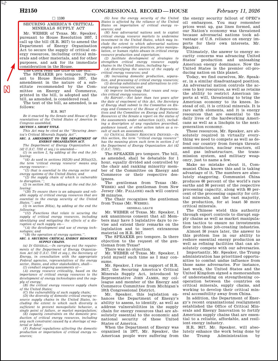 Sec. 4. Upon adoption of this resolution it shall be in order to consider in the House the bill (H.R. 3617) to amend the Department of Energy Organization Act to secure the supply of critical energy resources, including critical minerals and other materials, and for other purposes. All points of order against consideration of the bill are waived. The amendment in the nature of a substitute recommended by the Committee on Energy and Commerce now printed in the bill shall be considered as adopted. The bill, as amended, shall be considered as read. All points of order against provisions in the bill, as amended, are waived. The previous question shall be considered as ordered on the bill, as amended, and on any further amendment thereto, to final passage without intervening motion except: (1) one hour of debate equally divided and controlled by the chair and ranking minority member of the Committee on Energy and Commerce or their respective designees; and (2) one motion to recommit.