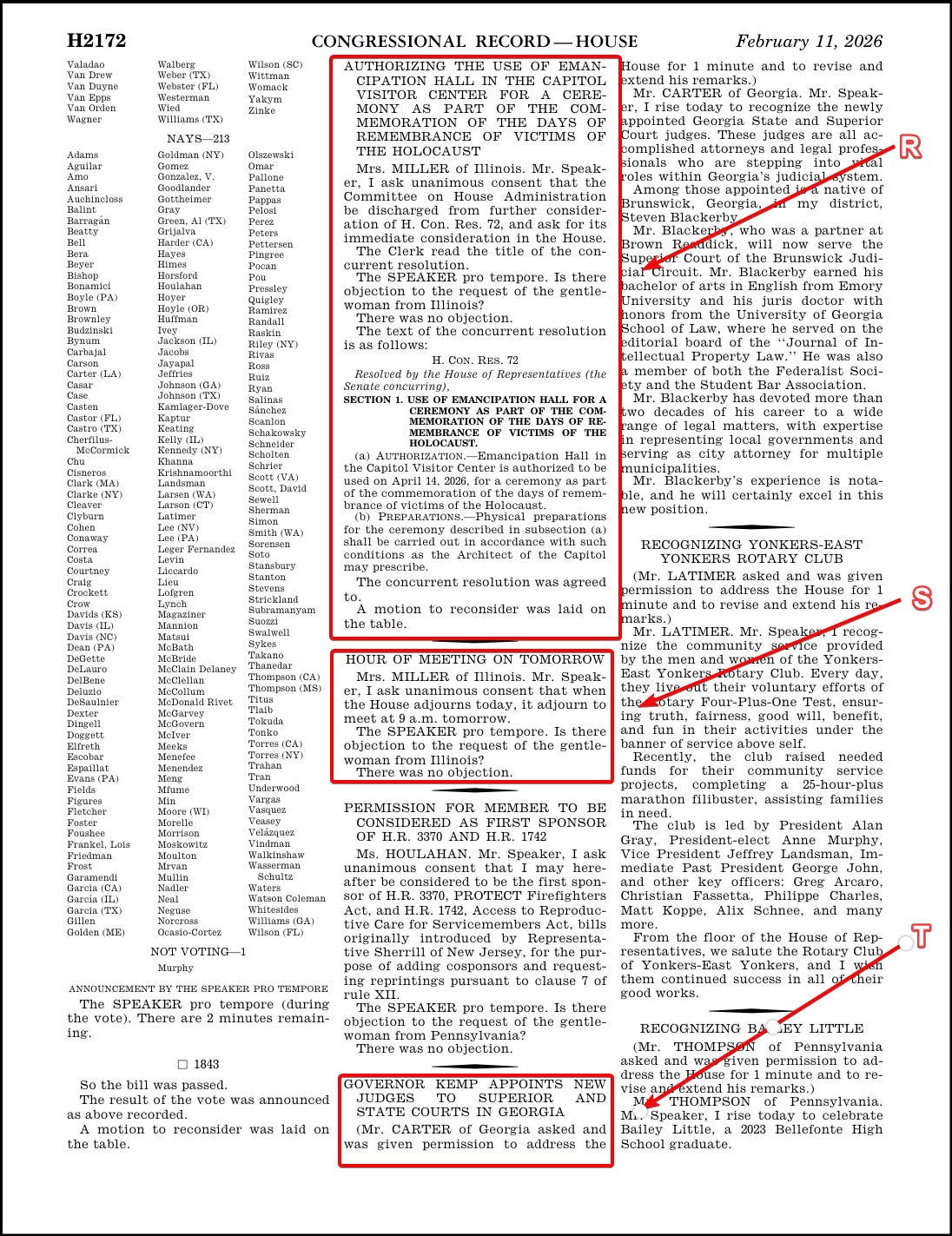 R. Unanimous consent to discharge a resolution and consideration of it. After the vote stack, the House will return to the regular order of business, barring interruption. But there’s always an interruption. Here, Rep. Miller asks unanimous consent to discharge a resolution (H.Con.Res.72) from committee and consider it. It is granted. The resolution is non-controversial—it provides for the use of emancipation Hall for a commemoration—and it is agreed to by voice vote. Almost no one is in the House chamber, most Members having left after the vote stack.