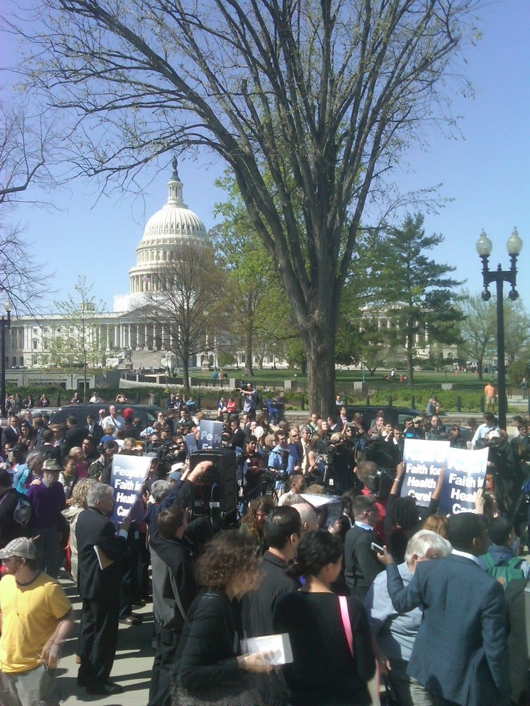 1. The scene in front of the Court was not particularly memorable. Pretty weak showing by the demonstrators today. Maybe that was because no one cares about the Anti-Injunction Act and everyone is saving their big guns for tomorrow. Maybe it was because this is just another stop on a multi-year protesting circuit around this issue. It certainly wasn't the weather: a windy but otherwise beautiful March day in Washington, with flowers in bloom and barely a cloud in the sky. By the time I got there, the grassroots protesters were easily outnumbered by the suits and media and, well, people like me, down there to take it all in and gawk. There was very little animosity; I saw a handful of cross-ideological chats going on. No slogans being shouted. Pretty serene, actually. Nothing compared to the major right-to-life protests, which are easily 100 or 500 times as large.