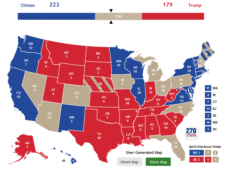 2) Learn the Electoral College landscape cold. You need 270 electoral votes to win the Presidency on Election Day. Here's the map of states that aren't competitive. If we assign these as already locked-in, then there are now 223 electoral votes for Clinton and 179 for Trump: