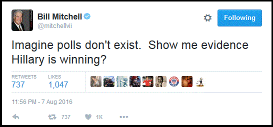 5) Bill Mitchell. You must follow Bil Mitchell (@mitchellvii) on Twitter. If you aren't familiar with him, he has become the ultimate pro-Trump internet troll, producing horror in those well-versed in the science of statistics, joy in the hearts of those who can appreciate a good KenM trolling performance, and total suspense for everyone who wants to know what what he's going to say/do when Trump actually loses. Or wins. Also, he's cruising at about 300 tweets/day. I'm not kidding; this might be the most important piece of advice in the list. I mean, just look at this brilliant piece of buffoonery / performance art: