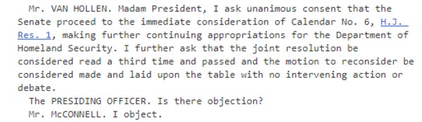 The action in the Senate did not take very long. While there were a lot of speeches—this is the Senate, after all—the actual procedural consideration of the bills was very short. Here’s the transcript of the entire attempt to bring up H.J.Res.1: