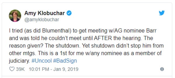 Earlier this week, President Trump’s nominee to replace Jeff Sessions as Attorney General, William Barr, made some news when he initially was refusing to take meetings with some Democratic Senators on the Judiciary Committee ahead of his confirmation hearing with the committee, scheduled for next Tuesday. This did not sit well with some Senators. Here’s Senators Klobuchar (D-MN):