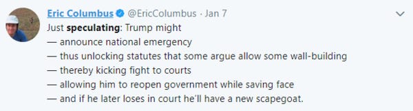 Here’s a good state-of-play article from Matt Fuller. The most important development in the last week has been the mainstream acceptance in DC of a new obvious face-saving off-ramp for the president. Call it the National Emergency Gambit (NEG). Here’s how Eric Columbus put it on Monday: