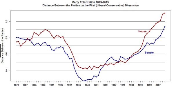 Using this metric, contemporary politics is more polarized than ever. But it’s not radically different than it was 100 years ago, it’s just radically different than everyone’s go-to baseline: the post-war period, and specifically 1960s. We don’t have varying cross-party coalitions all the time in the House across all sorts of different issues, we don’t have a huge bipartisan alliance on of the major issues of the day, like we did with civil rights. But those things don’t make today’s politics unprecedented. They just make it more like it was before the short period of time when things operated that way, which happens to be our standard frame of reference.