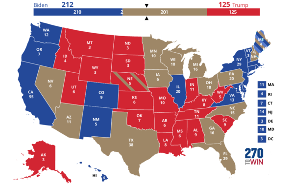 You need 270 electoral votes to win the Presidency on Election Day. Here’s the map of states that aren’t competitive. If we assign these as already locked-in, then there are now 212 electoral votes for Biden and 125 for Trump: