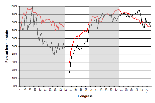 Two things stand out, neither of which is particularly surprising. First, it appears that historically, a higher percentage of southern Representatives and Senators were born in-state. I suspect this is also true of the northeast, and confirms the hypothesis that western Members are the cause of the lower aggregate in-state numbers. Second point: the post-civil war carpetbagging is plain to see, and quite striking. Not until around the 51st-55th Congresses do the in-state Representative numbers return to pre-war levels. That was the 1890s!