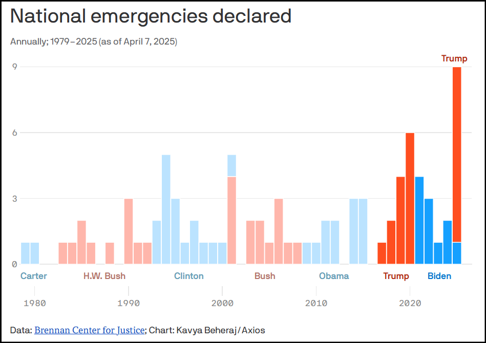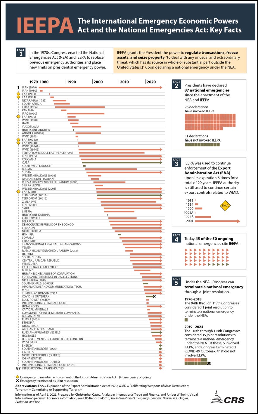 Much less impressive has been Congress’ ability to control use of the emergency powers delegated to the president via the NEA and IEEPA, as well as the post-Watergate constraints of Nixon-era presidential overreach, in the War Powers Resolution and the Impoundment Control Act. The substitution of joint resolutions of disapproval for legislative vetoes has tilted all of these laws toward the presidency, and made congressional attempts to curb executive actions under them mostly inert. And, indeed, declared emergencies have skyrocketed in the last several decades; there are currently 51 in effect, some of them dating back decades. A massive proportion of them are IEEPA emergencies; many people just accept IEEPA now as a regularized tool of presidential trade power.